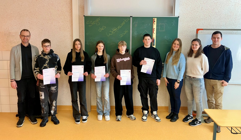 Erfolgreich und mit viel mathematischem Geschick haben sich Igor Dück (8R), Emily Fehrensen und Sophie Rudolph (beide 8G2) sowie Benedikt Kranz und Justin Schmuland (beide 8H) als beste Teilnehmerinnen und Teilnehmer beim diesjährigen Schulentscheid des Mathematikwettbewerbs durchgesetzt. In den einzelnen Zweigen wurden die ersten drei Plätze ermittelt, wobei es im Gymnasial- sowie im Hauptschul-Zweig zu einem besonderen Ergebnis kam: Zwei Schülerinnen und zwei Schüler erzielten exakt die gleiche Punktzahl und teilen sich dort den ersten Platz.