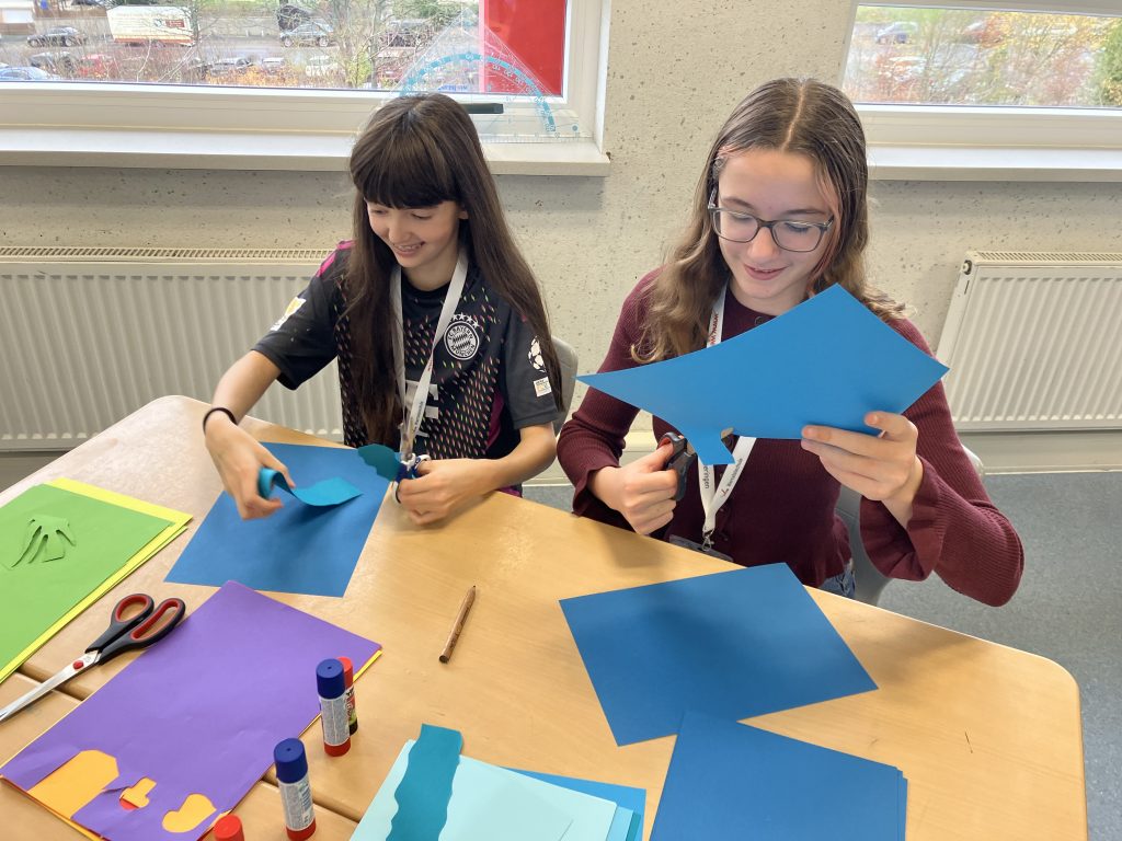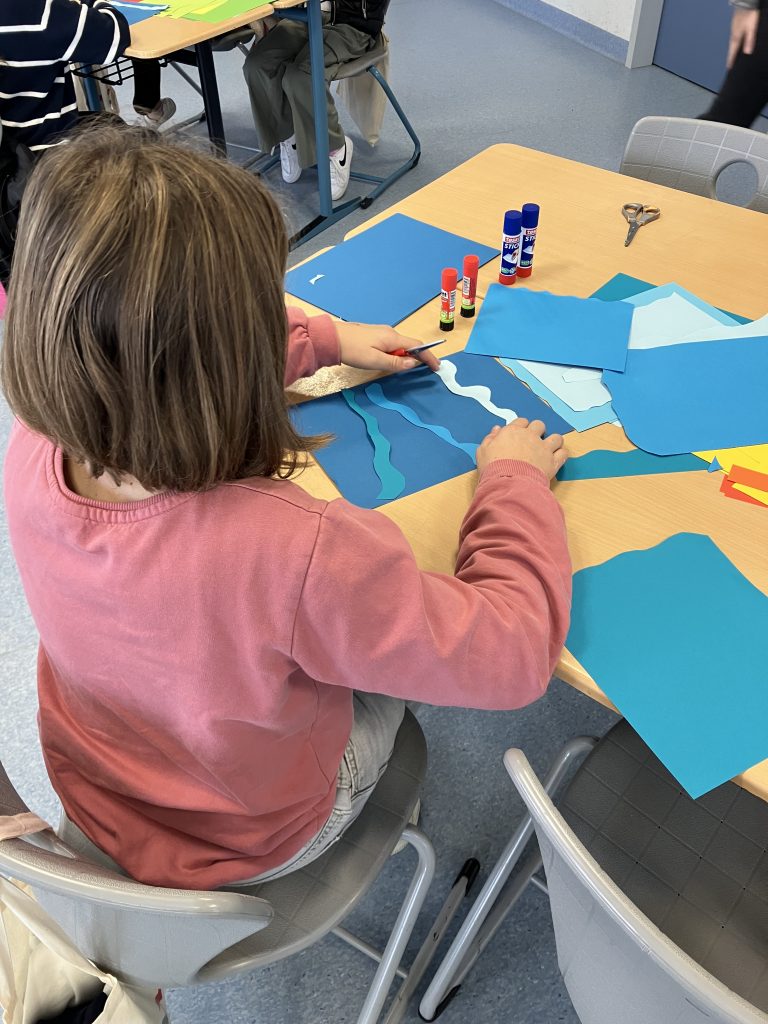 Auch die kreativen Fächer präsentierten sich von einer neuen Seite. Statt der traditionellen Höhlenmalerei durften die Kinder diesmal eine moderne Technik ausprobieren: „Mit Schere malen“ – eine Collage- und Schnitttechnik, die viele kleine Kunstwerke entstehen ließ. In der Aula konnten zudem verschiedene Musikinstrumente ausprobiert werden, unterstützt von Mitgliedern des Schulorchesters und der Bläserklasse, die mit Geduld und Begeisterung erklärten und vormachten.