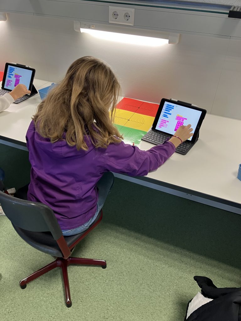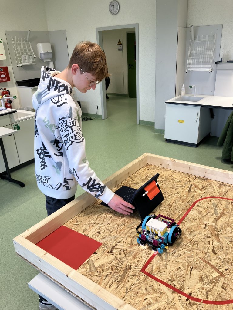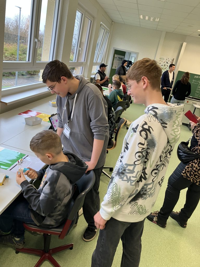 Im Anschluss wurden die Kinder in Gruppen durch das Schulgebäude geführt: Während in den Chemieräumen eifrig Glibberschleim angerührt werden konnte, lockte in der Sporthalle ein herausfordernder Bewegungsparcours und in der Holzwerkstatt verwandelten sich einfache Holzformen in farbenfrohe Kunstwerke. Ganz neu im Programm war in diesem Jahr die Robotik-Station, an der die Viertklässlerinnen und Viertklässler kleine Programme erstellen und einfache Roboter steuern konnten.
